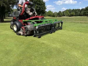 “Le fabricant alsacien Hege Applications a développé le Green Rake, un outil dédié à l’entretien quotidien des greens et en particulier à la lutte contre le pâturin naturel, graminée envahissante qui dégrade les surfaces de jeu.”